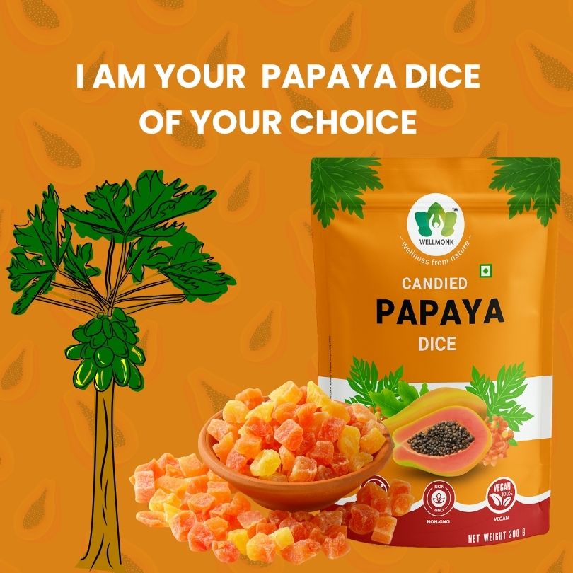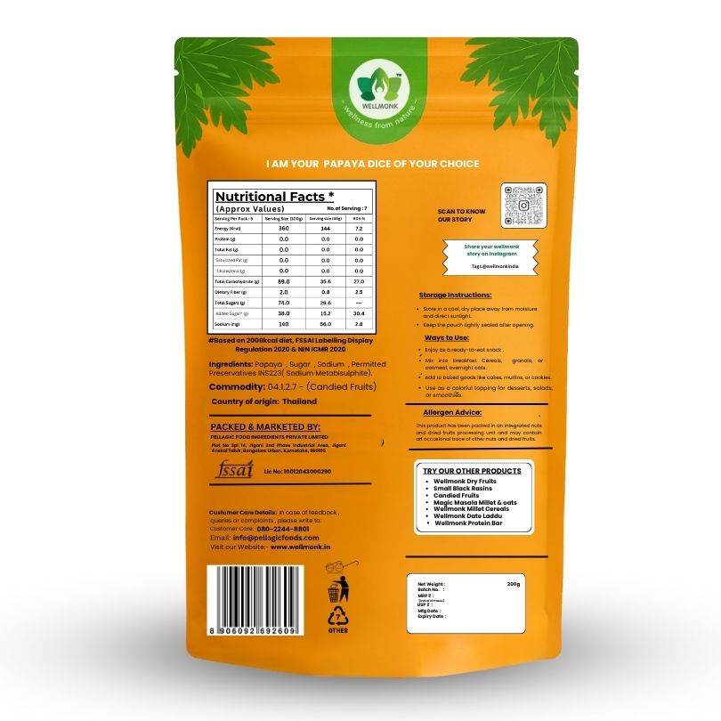Wellmonk Candied Papaya Dice brings you the goodness of tropical sweetness in every bite! Made from naturally ripened papayas, these delicious candied dice are perfectly dried and coated to preserve flavor, color, and nutrition.