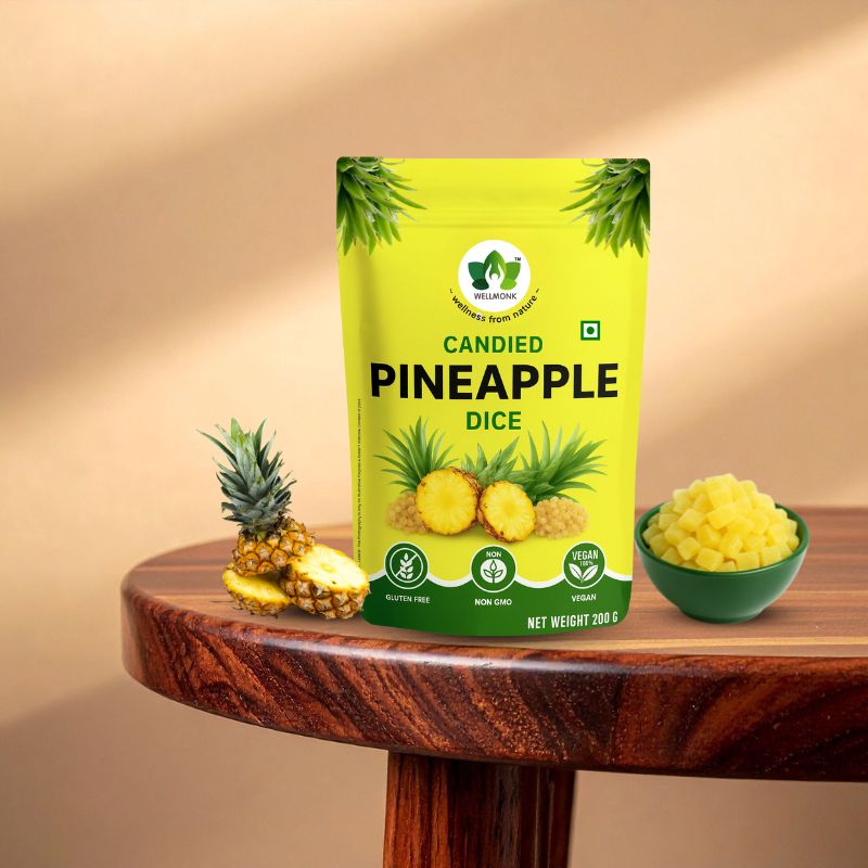 Experience the tropical sweetness with Wellmonk Candied Pineapple Dice — a perfect blend of taste and nutrition! Made from premium pineapples, these candied dice are naturally sweet, chewy, and full of flavor. Ideal for baking, garnishing desserts, mixing in cereals, or enjoying as a tasty on-the-go snack.