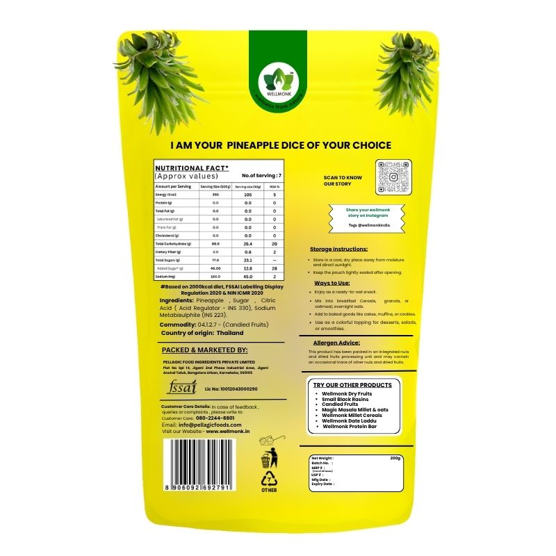 Whether you’re creating desserts, decorating cakes, or enjoying a healthy, fruity treat, Wellmonk Candied Pineapple Dice adds a burst of sunshine and sweetness to every moment.