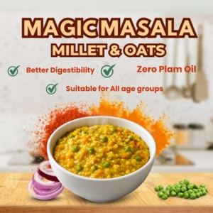 Revolutionize your snacking with WellMonk Magic Masala Millet & Oats, a delicious and nutritious blend of wholegrains, vegetables, and flavorful spices. Packed with the goodness of oats, millets, and dehydrated vegetables, this quick and easy-to-prepare snack is perfect for those who prioritize health without compromising on taste. Benefits: High in Wholegrains: Supports digestion and provides sustained energy. Quick & Convenient: Ready to cook in minutes, perfect for busy days or a light meal. No Artificial Additives: Made with natural ingredients and spices, free from preservatives. Diet-Friendly: Suitable for vegetarians and a great addition to a balanced diet. How to Prepare: Add 2 cups of water to a pan and bring it to a boil. Stir in 1 cup of WellMonk Magic Masala Millet & Oats. Cook on medium heat for 4-5 minutes, stirring occasionally. Serve hot and enjoy the hearty flavors! How to Enjoy: As a light breakfast or mid-day snack. Pair with yogurt or chutneys for added flavor. Use as a base to create innovative dishes like millet masala patties. Storage Instructions: Store in a cool, dry place. Keep the pack tightly sealed to preserve freshness. Package Size: Net Weight: 400g Elevate your snacking game with WellMonk Magic Masala Millet & Oats – a perfect blend of health, taste, and convenience.