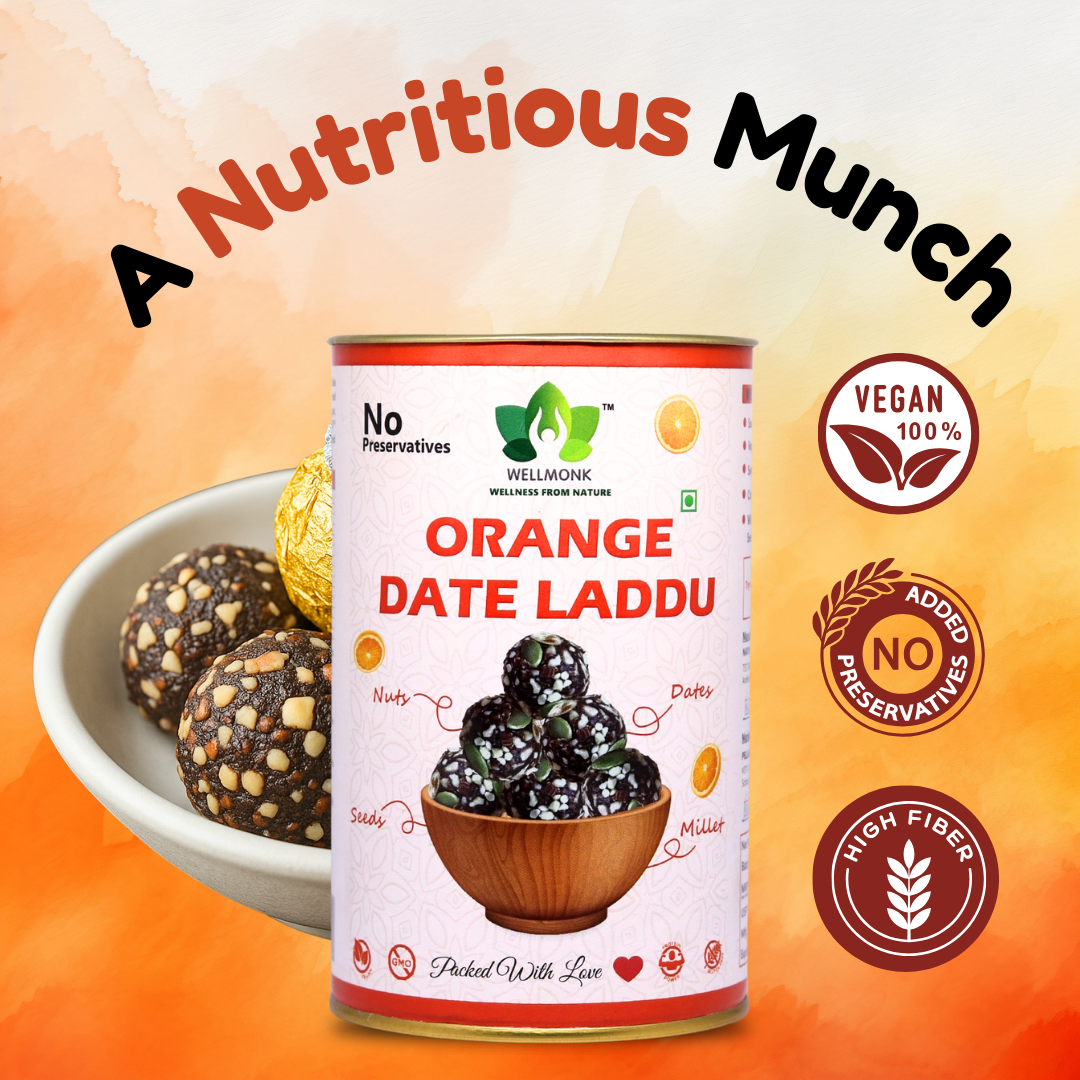 Satisfy your sweet cravings guilt-free with WellMonk Orange Date Laddu, a wholesome treat crafted with the goodness of natural ingredients. Perfect for anytime snacking or a healthy dessert option, these laddus bring together the richness of dates and the crunch of nuts and seeds with a orange delight.