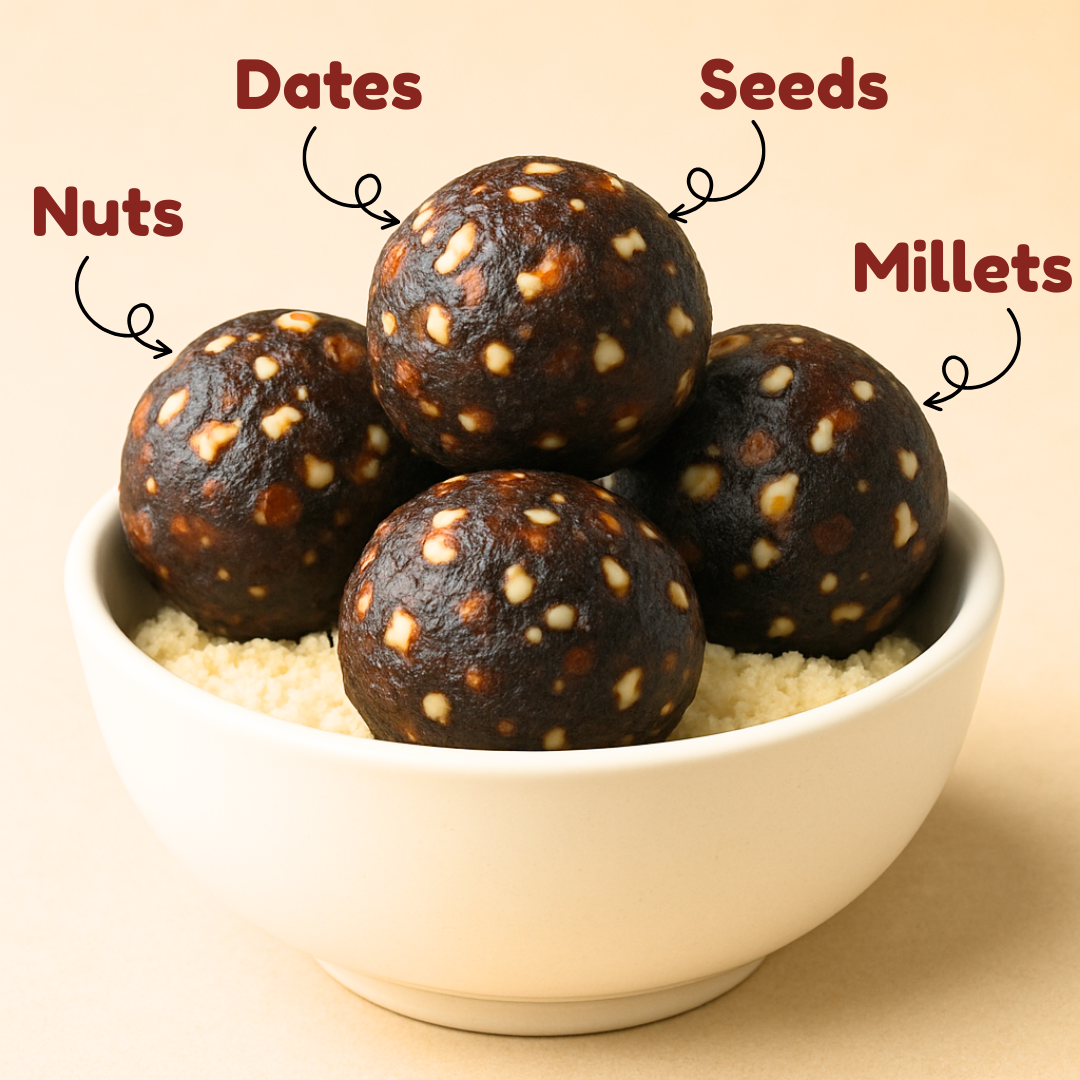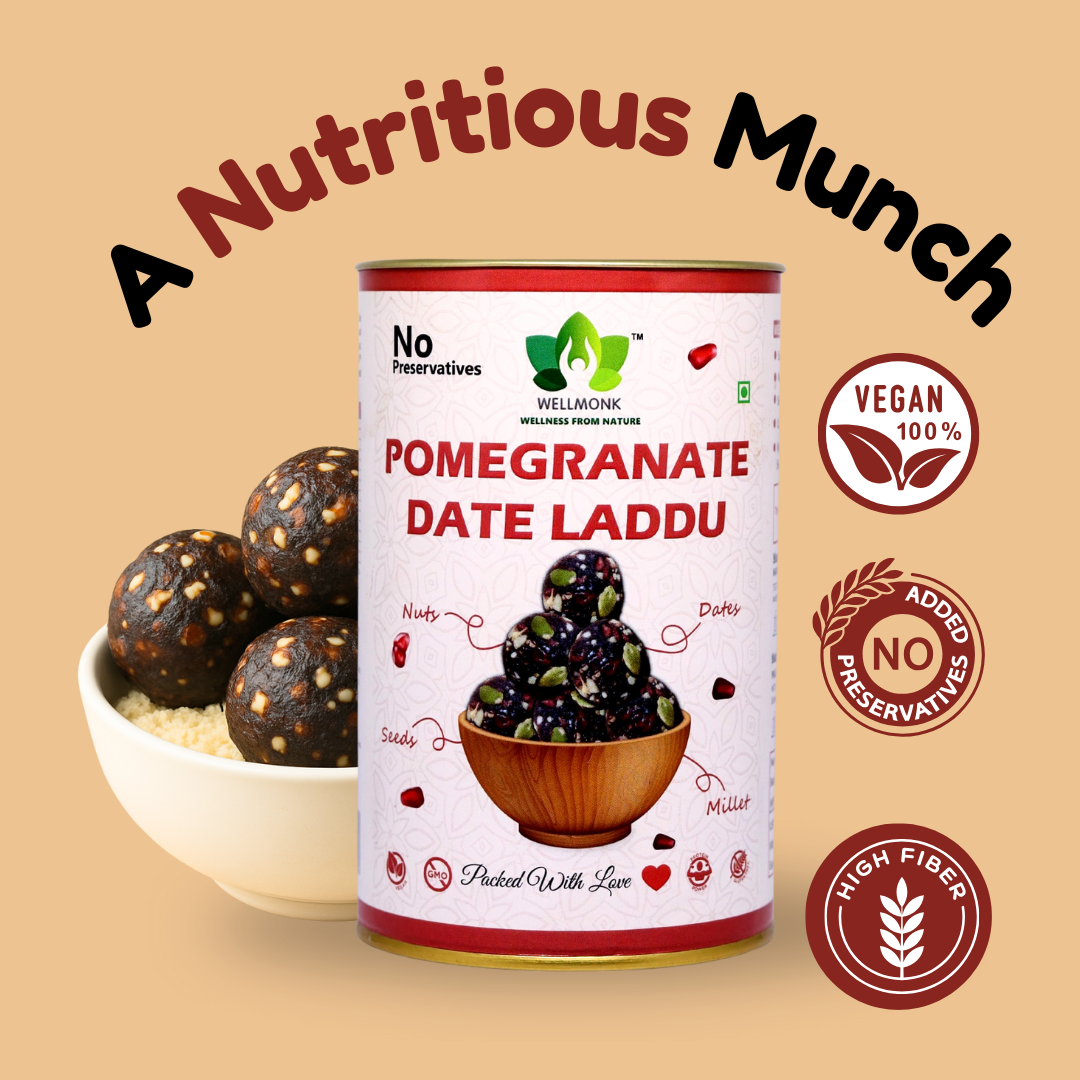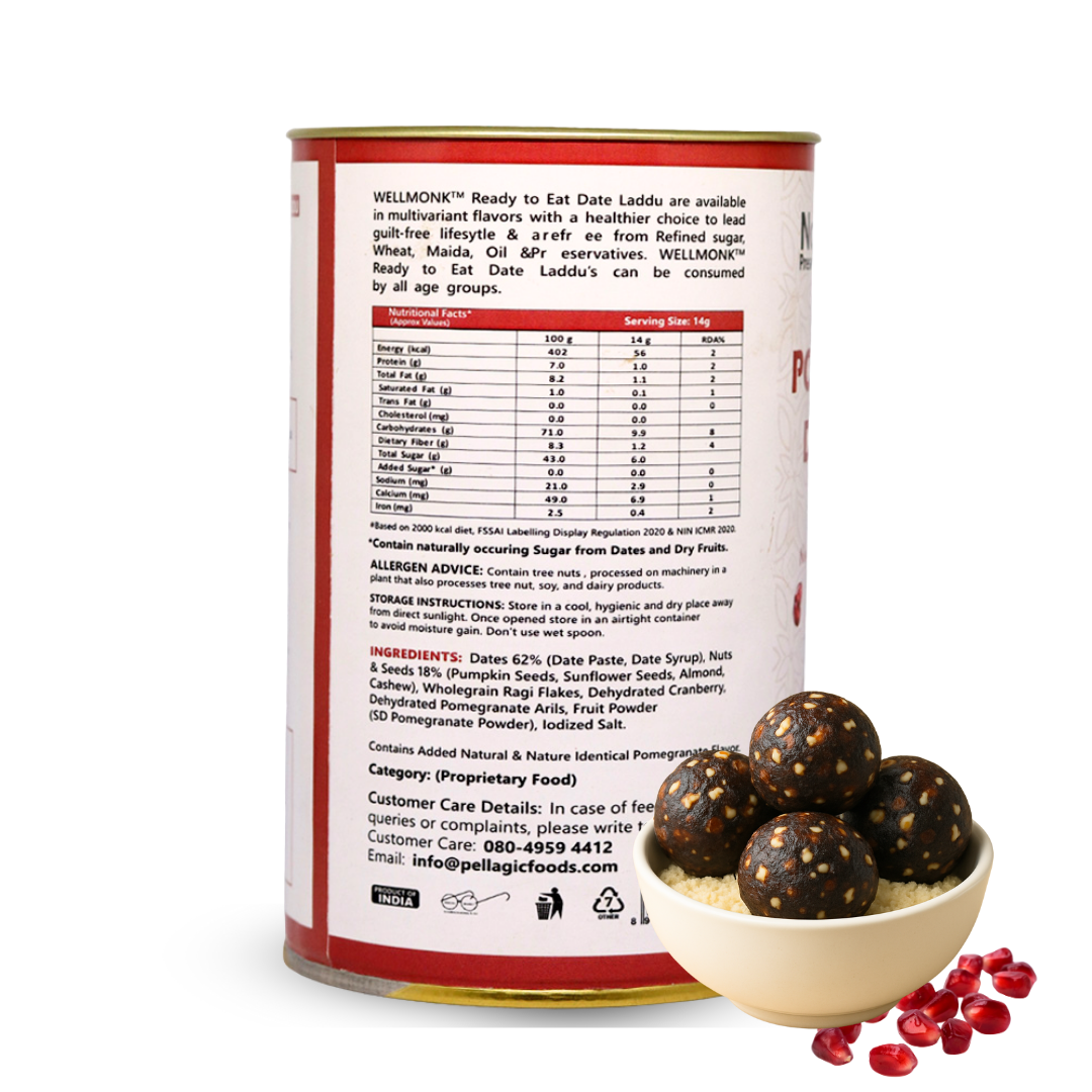 Satisfy your sweet cravings guilt-free with WellMonk Pomegranate Date Laddu, a wholesome treat crafted with the goodness of natural ingredients. Perfect for anytime snacking or a healthy dessert option, these laddus bring together the richness of dates and the crunch of nuts and seeds with a Pomegranate delight.