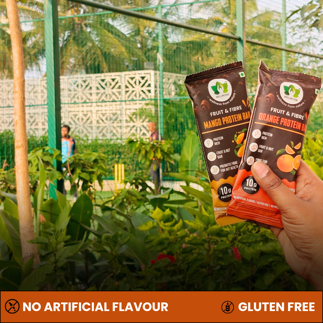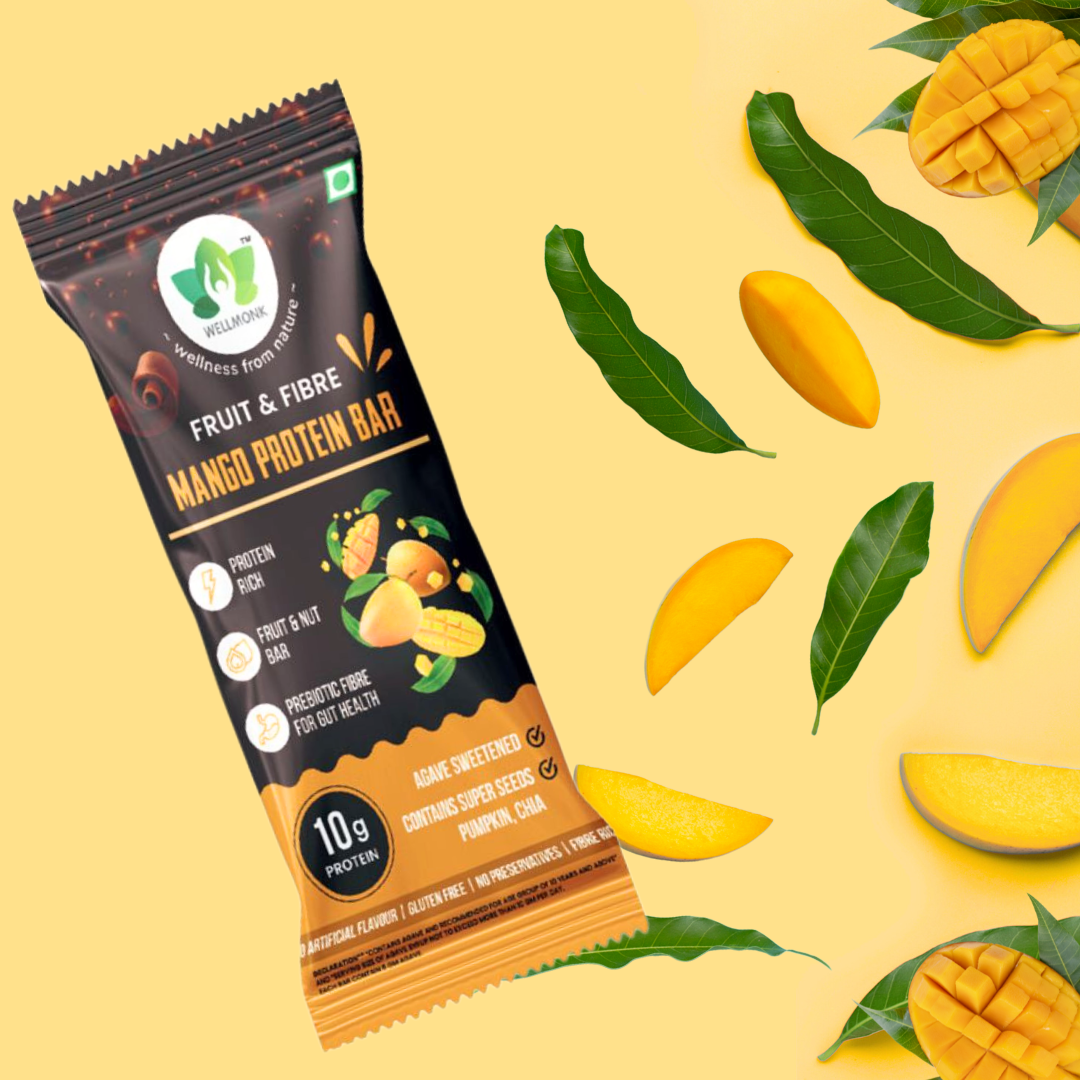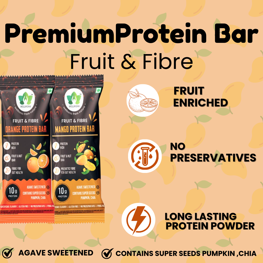 Product Description: Delight your taste buds and fuel your body with WellMonk Premium Protein Bars (Orange & Mango). Packed with 27% high-quality protein, these bars are enriched with real fruits, fiber, and nutrients, making them a perfect snack for your active lifestyle. Each pack contains 3 Orange Bars and 3 Mango Bars, giving you a delicious variety to enjoy anytime, anywhere. Why Choose WellMonk Premium Protein Bars? 1. Energy Booster: A perfect pre- or post-workout snack to fuel your energy needs. 2. Weight Management: High in fiber and protein to curb hunger and support your fitness goals. 3. On-the-Go Nutrition: Conveniently packed to suit your busy lifestyle. How to Enjoy WellMonk Premium Protein Bars: 1. Quick Snack: Satisfy mid-day cravings without compromising on health. 2. Workout Partner: Use as a pre- or post-workout snack to replenish energy and support recovery. 3. Travel Companion: Carry it along for hikes, trips, or busy days when you need a quick and nutritious pick-me-up. Allergen Advice: Contains Soy, Milk, Nuts, and Cereals. Storage Instructions: Store in a cool, dry place away from direct sunlight. Package Size: Pack of 6 Bars (3 Orange + 3 Mango), Net Weight: 50g per bar Enjoy the perfect blend of taste and nutrition with WellMonk Premium Protein Bars, crafted to energize your day naturally.