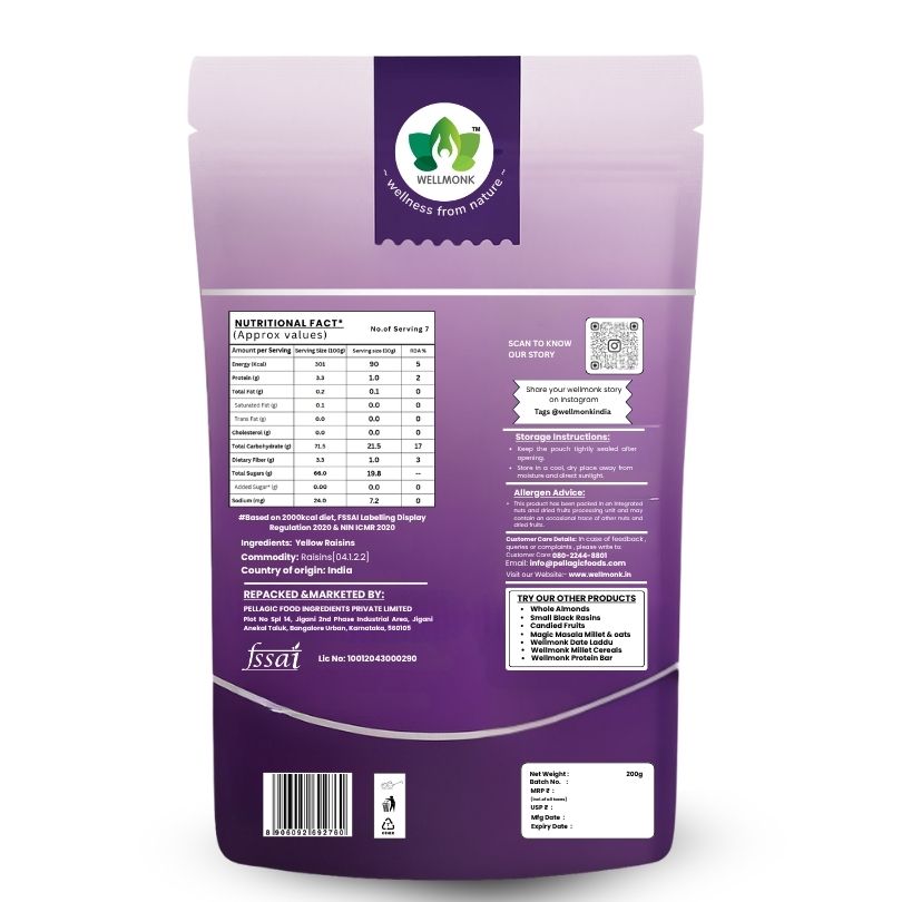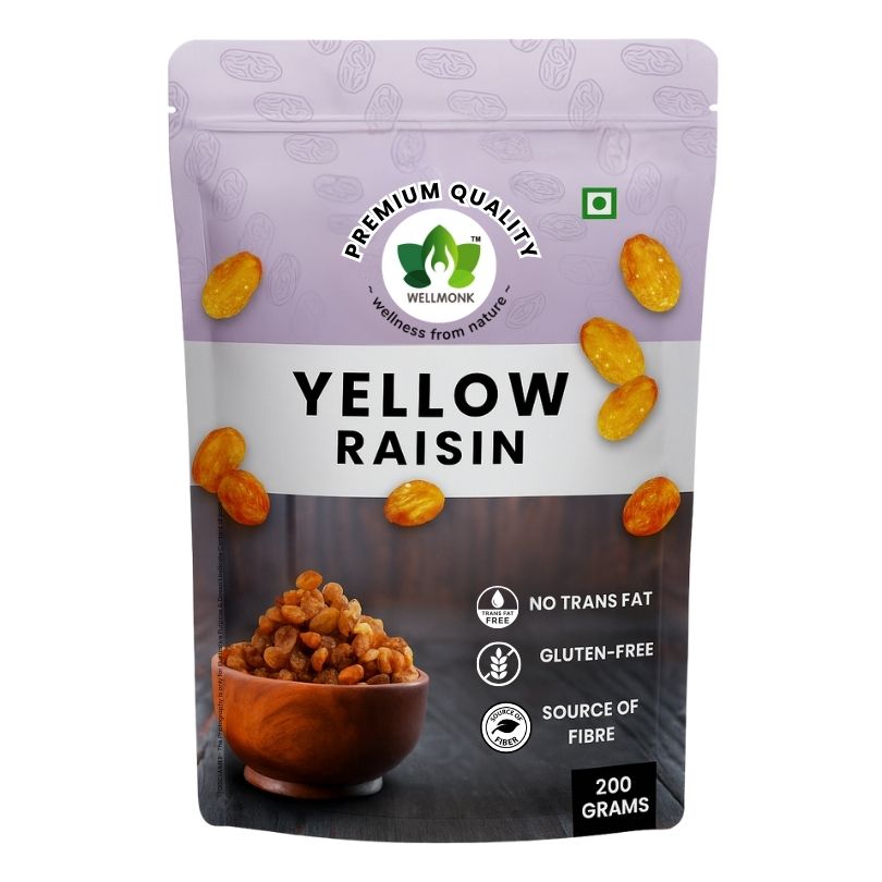 WellMonk Premium Yellow Raisins – 200g | Seedless Golden Kishmish | Dry Fruit Snack | Natural Sweetness for Snacking, Baking & Cooking