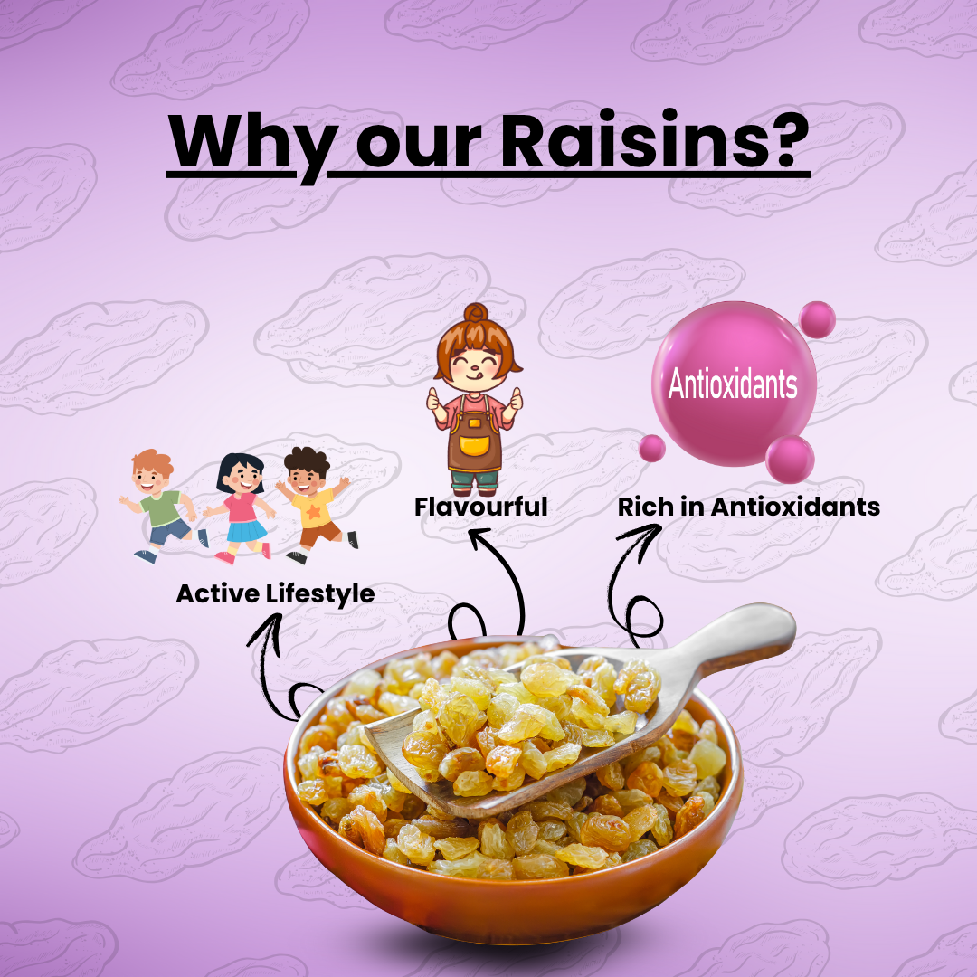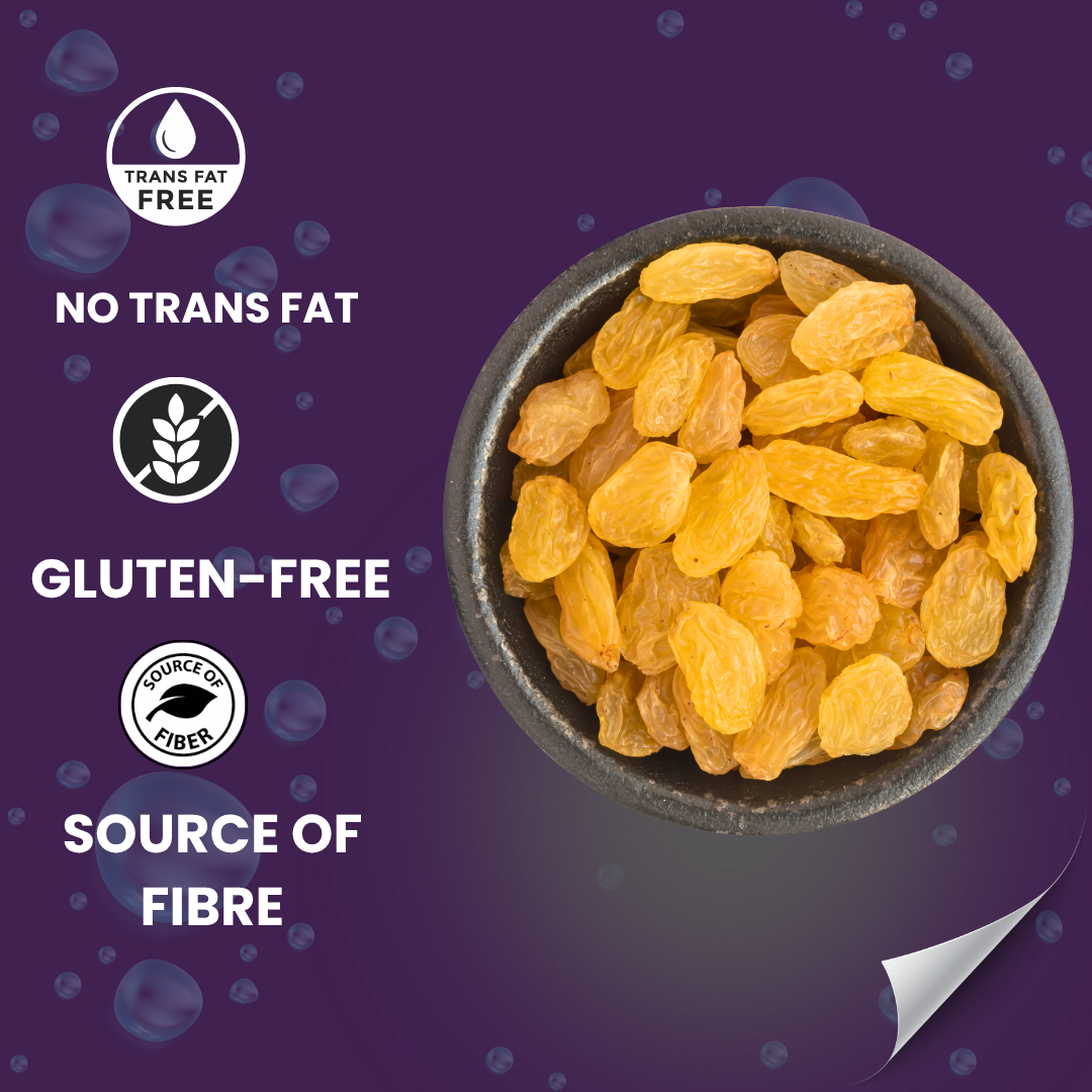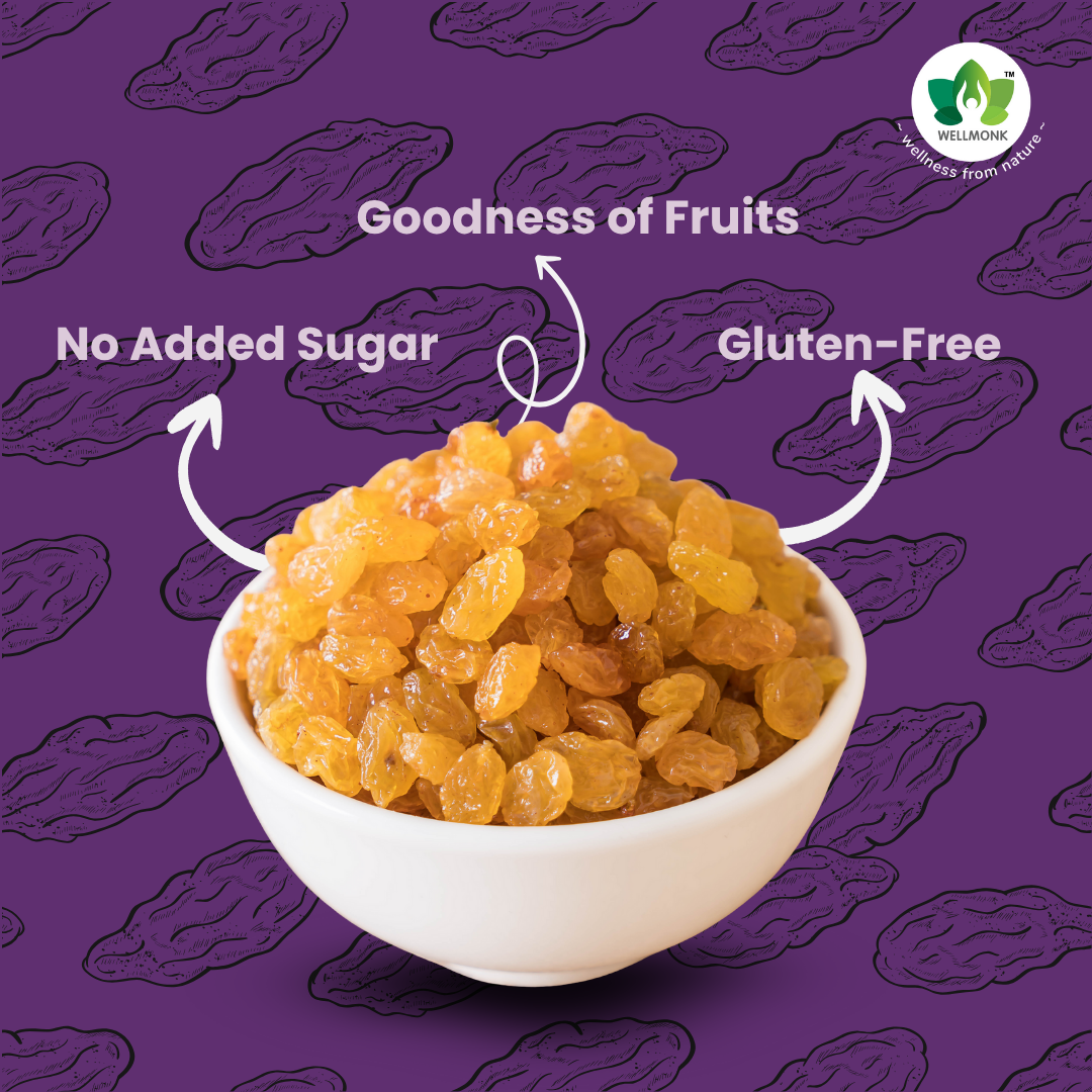 Discover the sweetness of WellMonk Premium Yellow Raisins, carefully handpicked and sun-dried to retain their golden color and rich taste. These seedless kishmish are a versatile dry fruit – perfect for snacking, adding to sweets, cakes, biryani, cereals, or desserts.